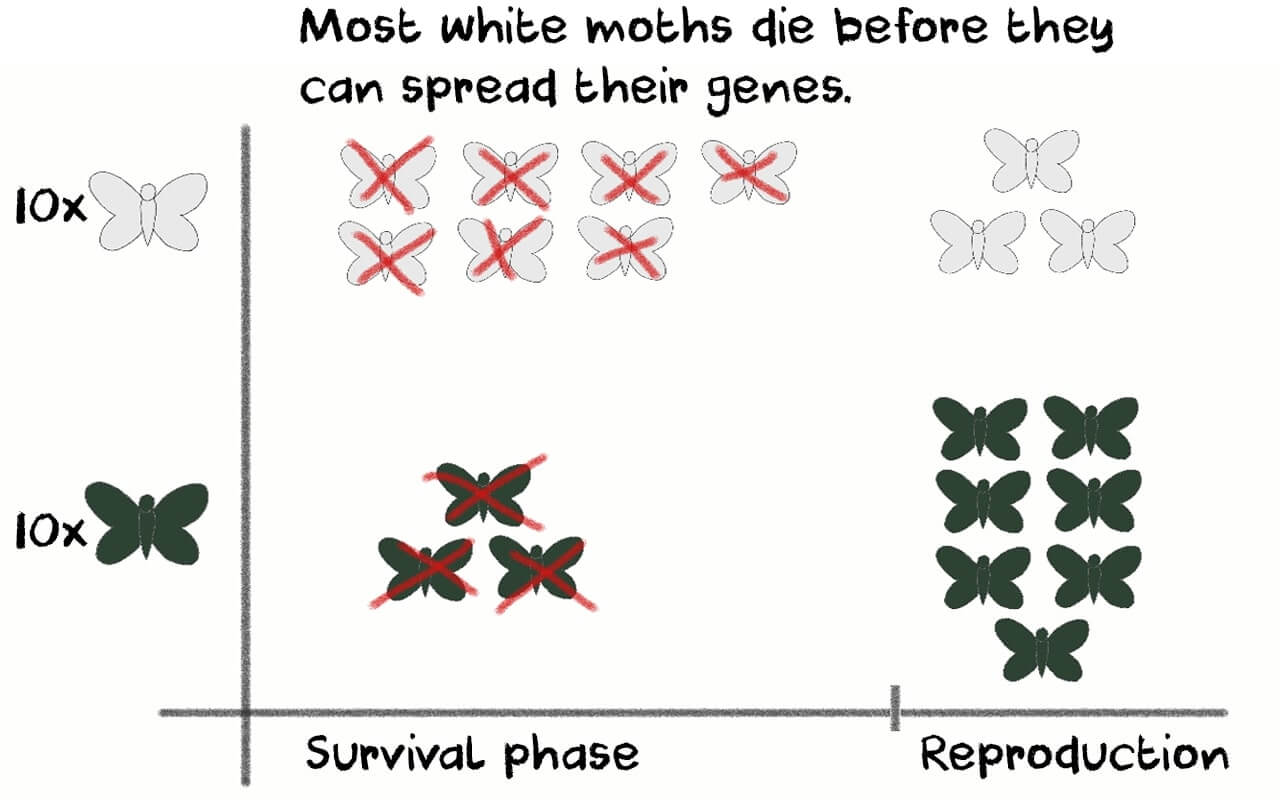 Because of their evolutionary adaptation, black moths survive longer than white moths, and are able to reproduce more frequently, which then passes on their black colored gene.