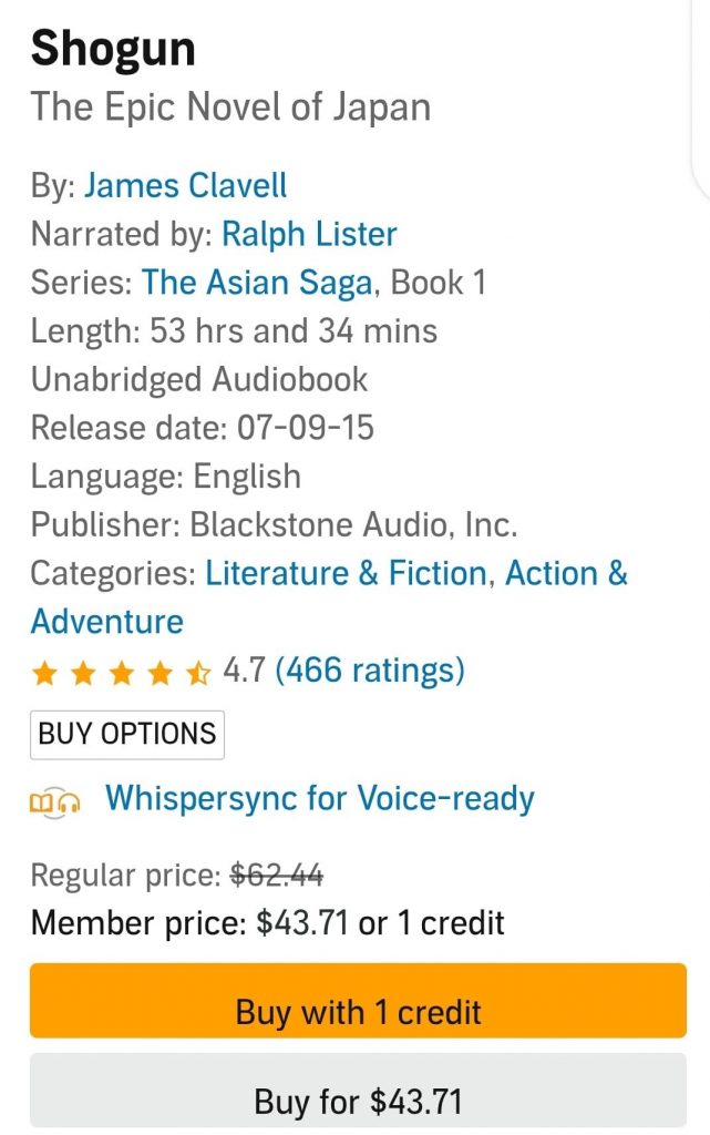 | 30 day free trial, with 1 free credit and access to another 10,000+ free audiobooks | Mobile app interface is annoying (except audiobook player, which is excellent) |