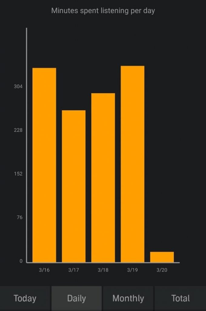 Audible has a neat feature that logs how much time you’ve spent listening to audiobooks in total, as well as a per day and per month breakdown.