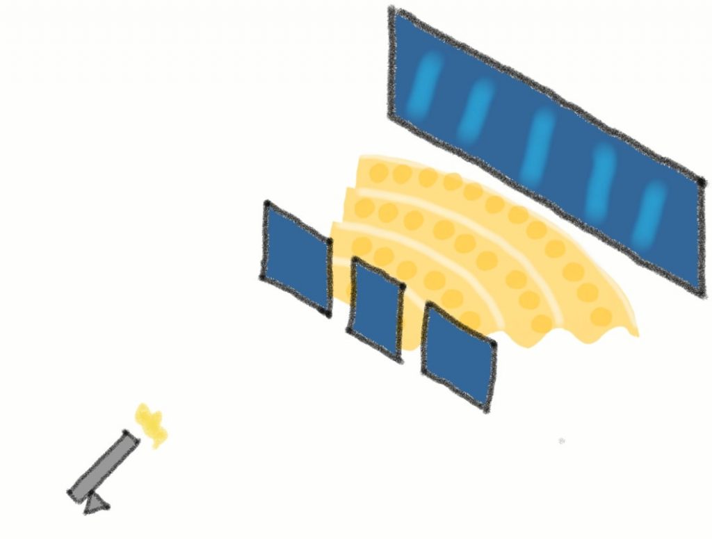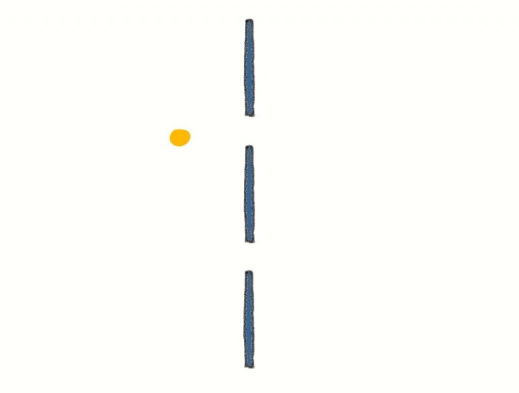In the sketch above there is just one particle. This is important, so we’ll say it again: there is only one particle. But each transparent shape represents just one possible position where you might find the particle.