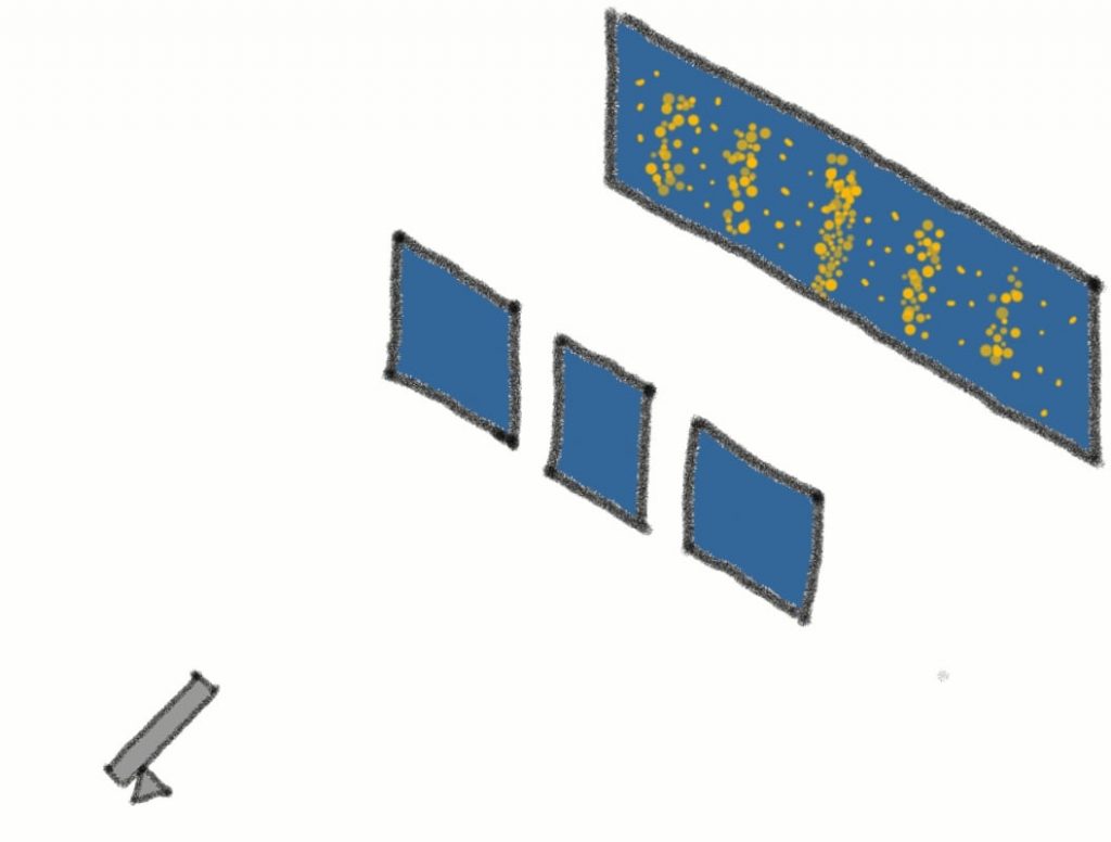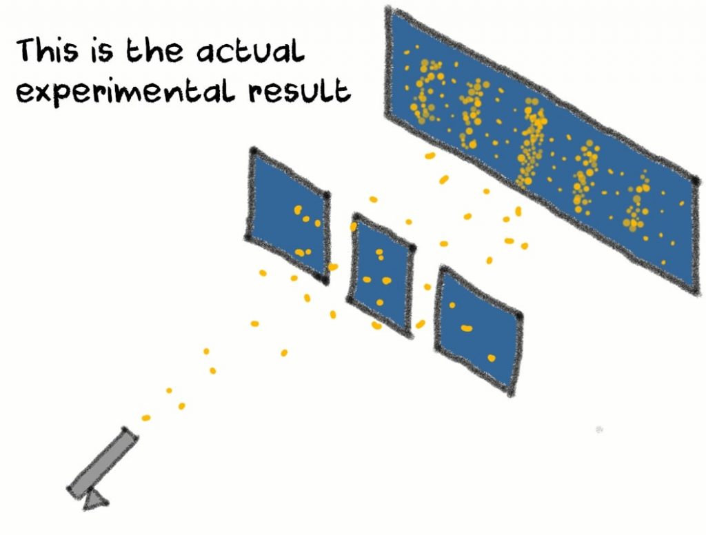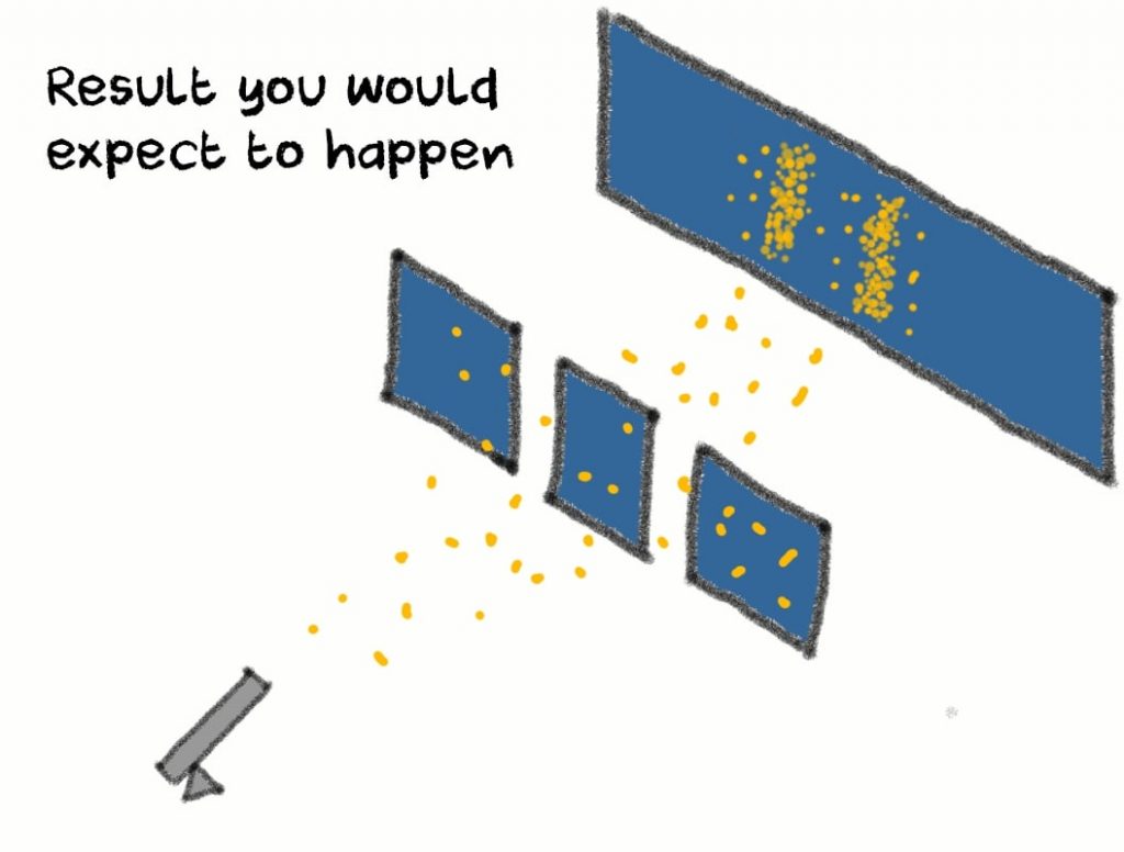 Now let’s go back to our two slit experiment. We’ve seen how particles form an interference pattern on the screen if you fire a large amount of them towards the slits.