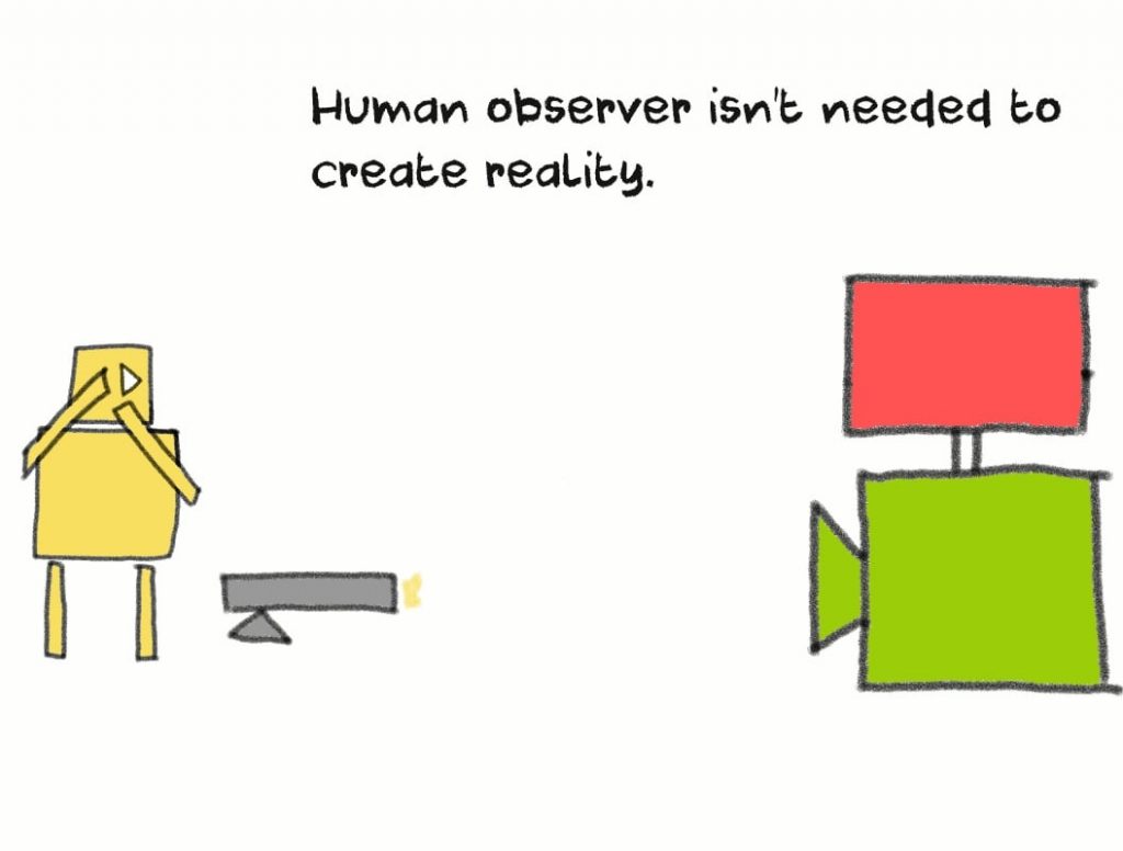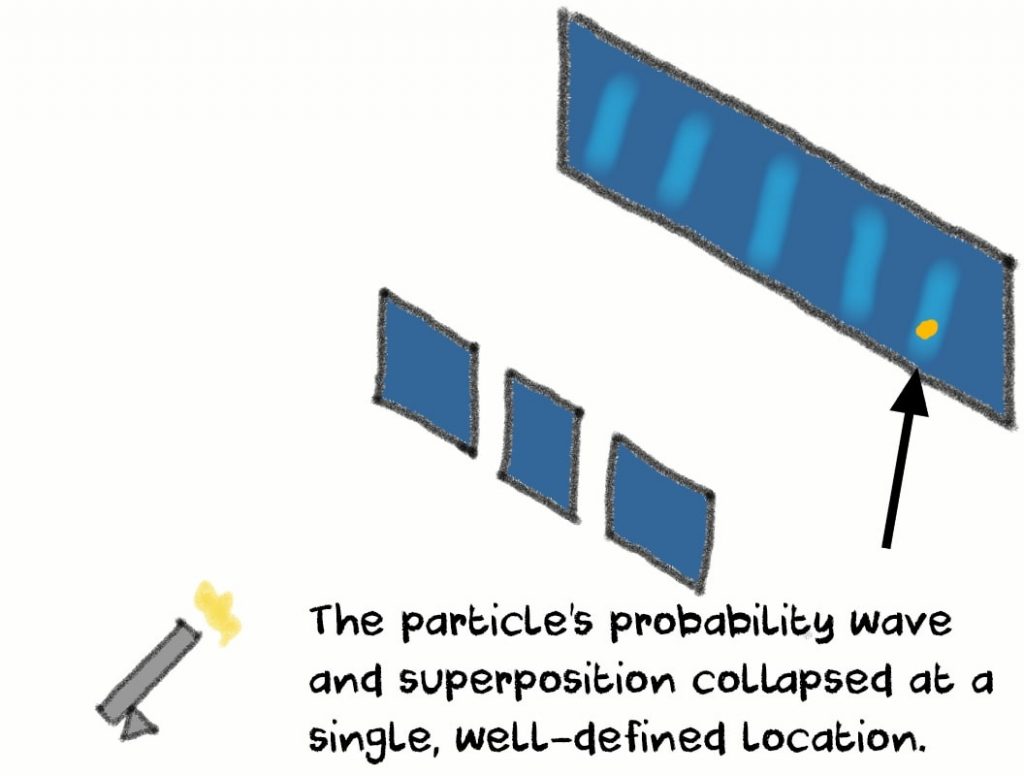 When the measurement takes place, it’s not actually the device which collapses the wave probability and superposition into a single point and state, but the consciousness of the observer.