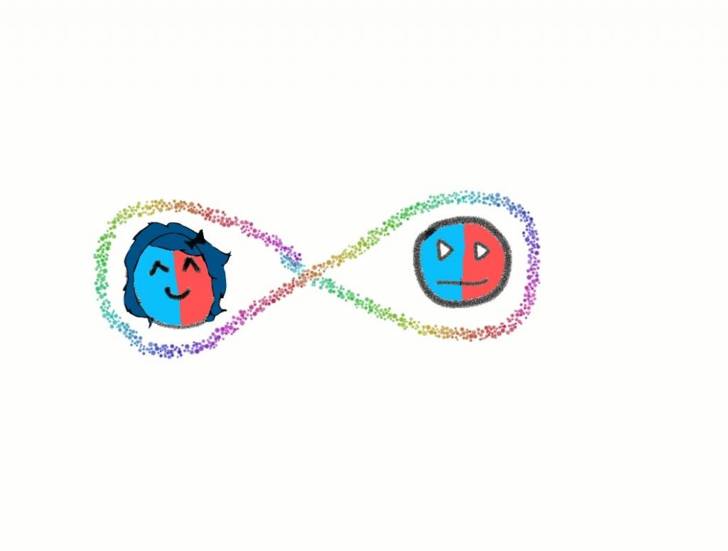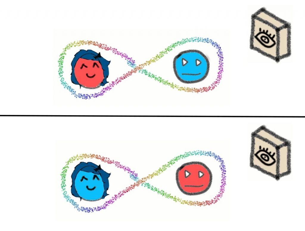 Unfortunately, Alice and Bob have very different tastes in the matter. As a result, they never agree to share the same color. Thanks to the voodoo connection, if Alice decides to be red, then Bob will automatically be blue and vice versa.