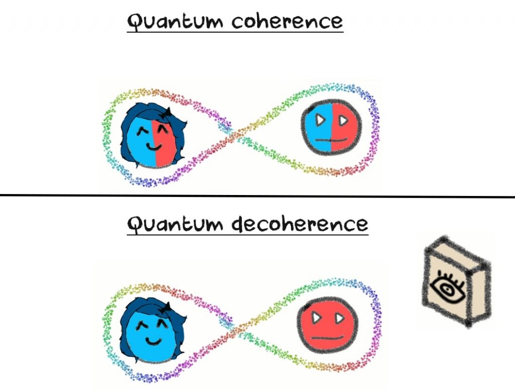 However, the more particles you add in a quantum system, the harder it is for all of them to stay coherent with one another. So at this point in time, the particles start to look for a single state all of them can be in. In our example based on colors, they want to settle on just one particular color.
