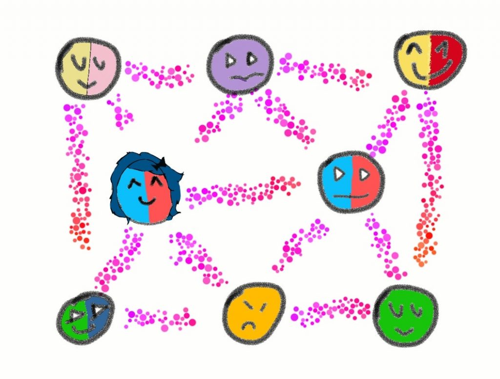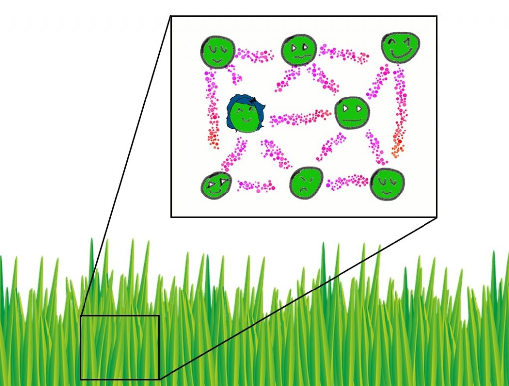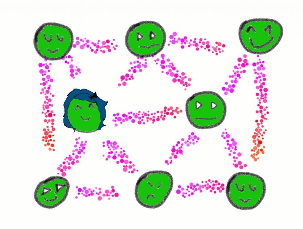 It’s impossible to isolate Alice and Bob’s quantum system from other particles in the environment. So over time, more and more particles join their quantum system. Imagine it as a web of particles.