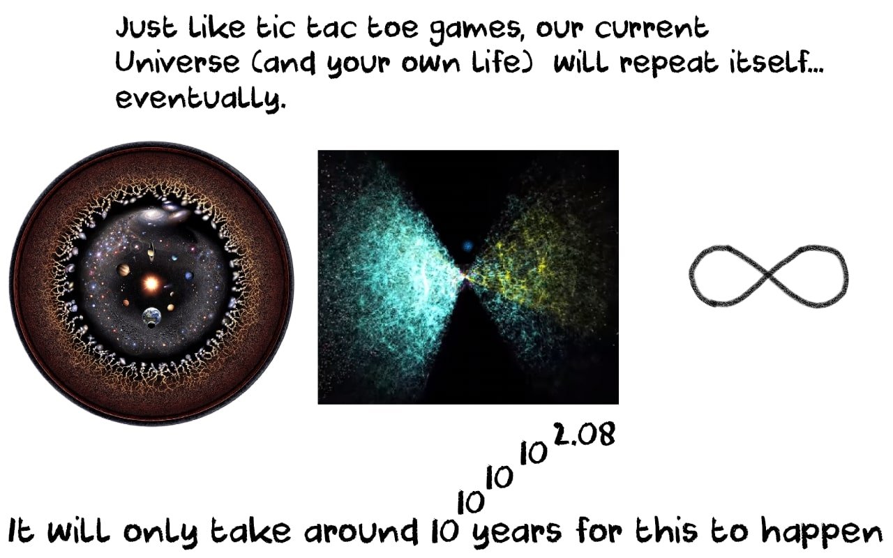However, the amount of possible atom combinations is still a finite number. But if time is infinite, then the exact combination of atoms that produced our Universe and your life will continue to repeat itself infinitely.