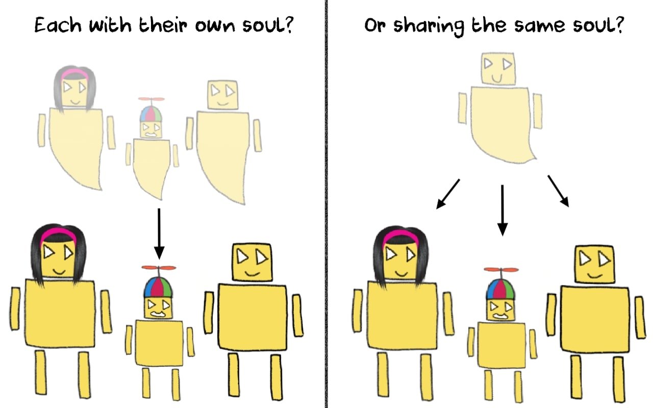 The short story doesn’t use the word “soul”, but the idea is close to it. Instead of each human having their own soul, we all share the same one, except that it’s reincarnated in billions of versions from the past, present and future.