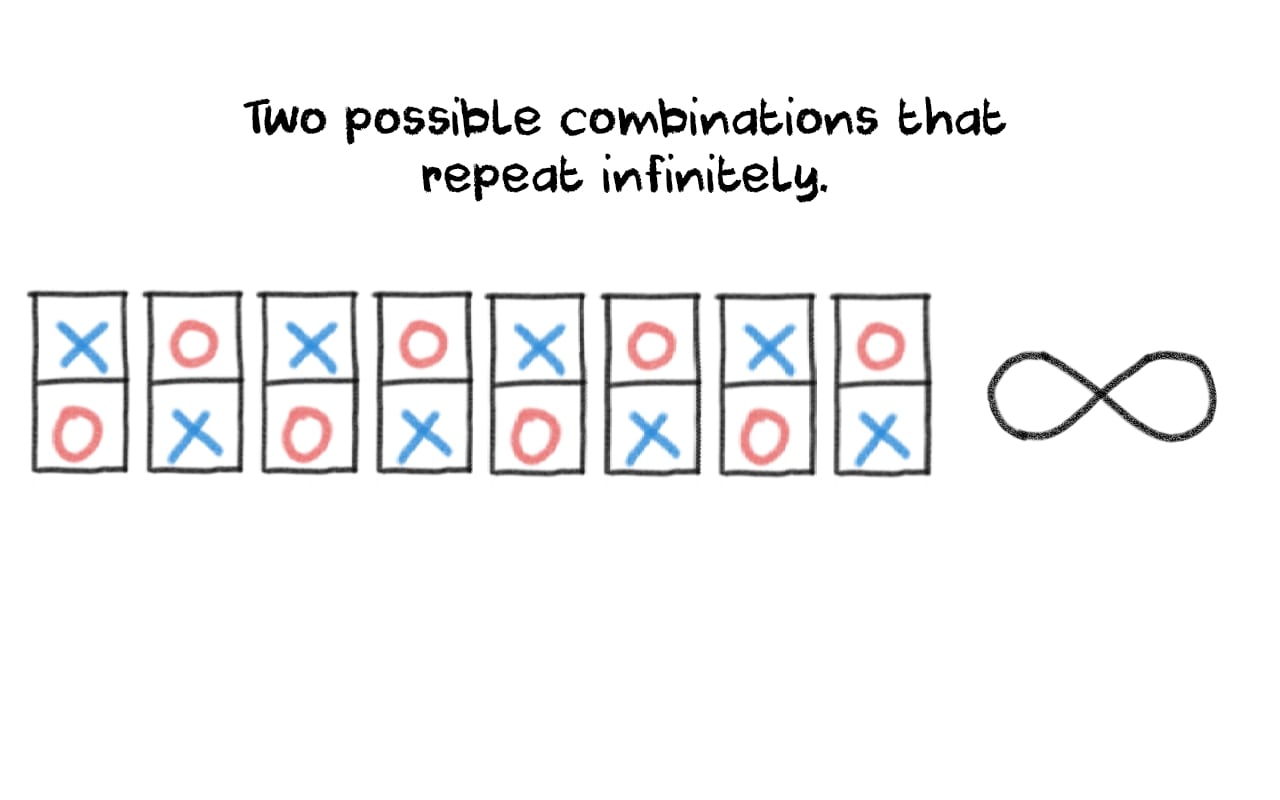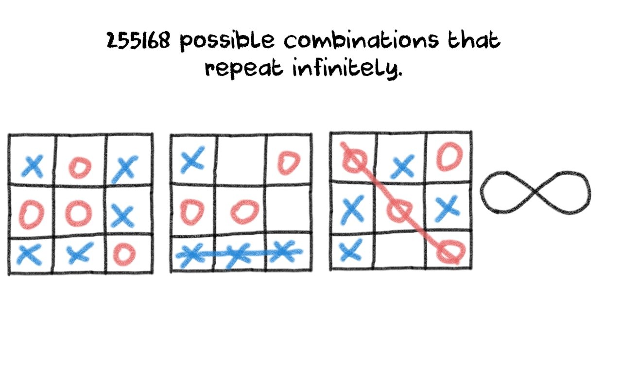 By comparison, a regular game of tic tac toe with 9 squares has 255168 possible combinations. This may seem like a lot, but if you play tic tac toe an infinite number of times, all of the 255168 possible combinations will repeat themselves endlessly.