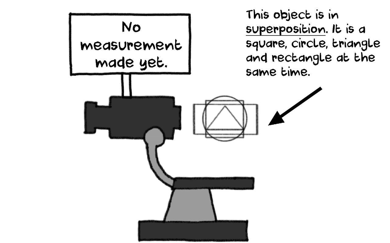 In other words, if the quantum object exists in a superposition where it is simultaneously a square, triangle, circle or rectangle, then 4 new parallel Universes split up, where each of these are realized.