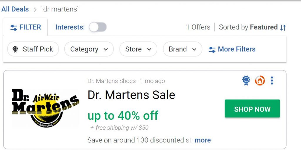 If you’re on the market to buy a certain product (for instance, Dr. Martens boots), you just type in the name of the product and see if there are any deals active.